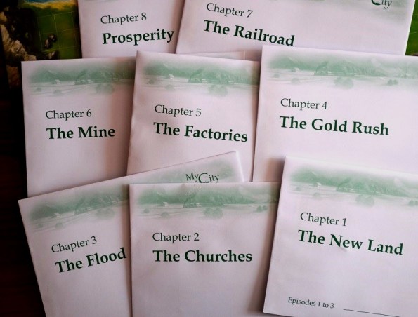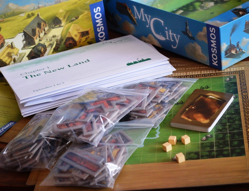 My City представляет собой несложное семейное евро (во всяком случае, поначалу) с популярной ныне механикой заполнения личного планшета фигурами полимино. Только тут вам предлагается отыграть кампанию длиною в 24 партии. Элементы “наследия” содержатся в 8 белых конвертах, которые подразумевают 8 глав, связанных какой-то одной темой. Каждая глава, в свою очередь, состоит из трёх эпизодов.