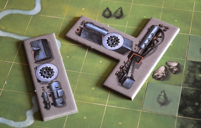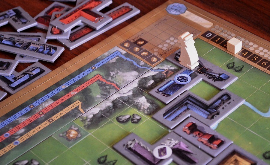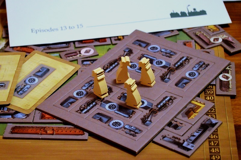Дальше – больше, и шестая глава вводит логическое продолжение всей этой индустриальной эпопеи в виде трёх глубоченных шахт, наклейки которых расположились в левой части планшетов. Шахты представляют собой три трека, к “входу” которых следует пристраивать здания соответствующих цветов. Чем больше группа – тем больше клеток зачёркиваешь в конце партии. Добрался до клетки с бонусом – он твой. Это может быть золотой слиток, очко прогресса, шестерёнка на синие здание и… железная дорога. Последнее – намёк на седьмую главу.