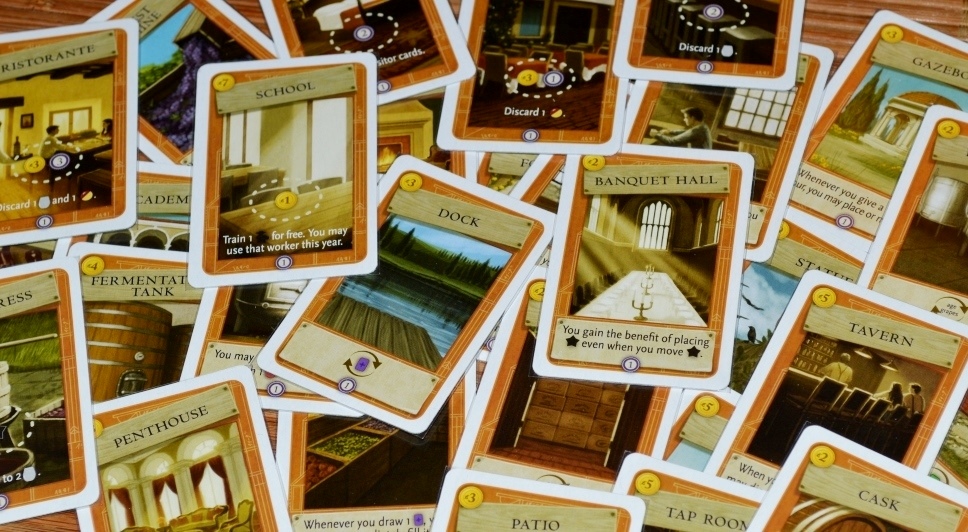 Viticulture: Tuscany – Structures. Опробовали модуль с постройками, представляющий собой стопку оранжевых карт различных вспомогательных сооружений.