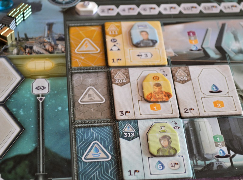 Плюс, размещение рабочих тут обильно так приправлено всякими фишечками. На центральное поле можно ходить только в заряженных экзокостюмах, а каждый рабочий имеет свою специализацию (бонус при выполнении определённых действий и, наоборот, запрет на посещение некоторых локаций) и привычку уставать.
