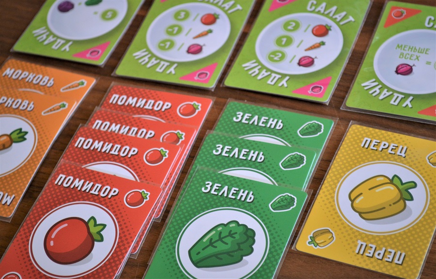 Задача – собрать побольше сетов, удовлетворяющих условия набранных рецептов. То есть, по ходу партии игроки как бы сами формируют для себя правила начисления очков. Причём, один и тот же овощ может участвовать во всех рецептах.