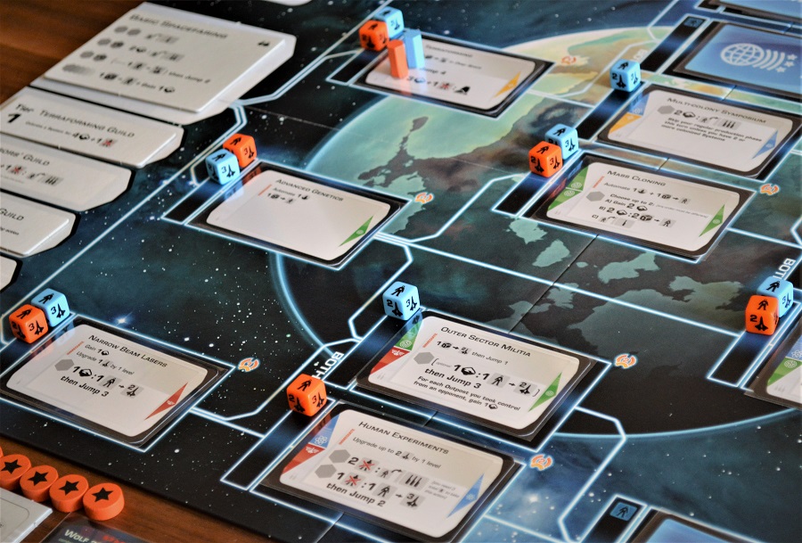 После пары партий не сказал бы, что технологии кардинально отличаются между собой, всё же сам принцип подразумевает либо высвобождение дисков с личного планшета, либо развитие на поле технологий и исследования. Посему зачастую продвинутые карты — это просто вариации базовых действий, но с разными опциями и бонусами.