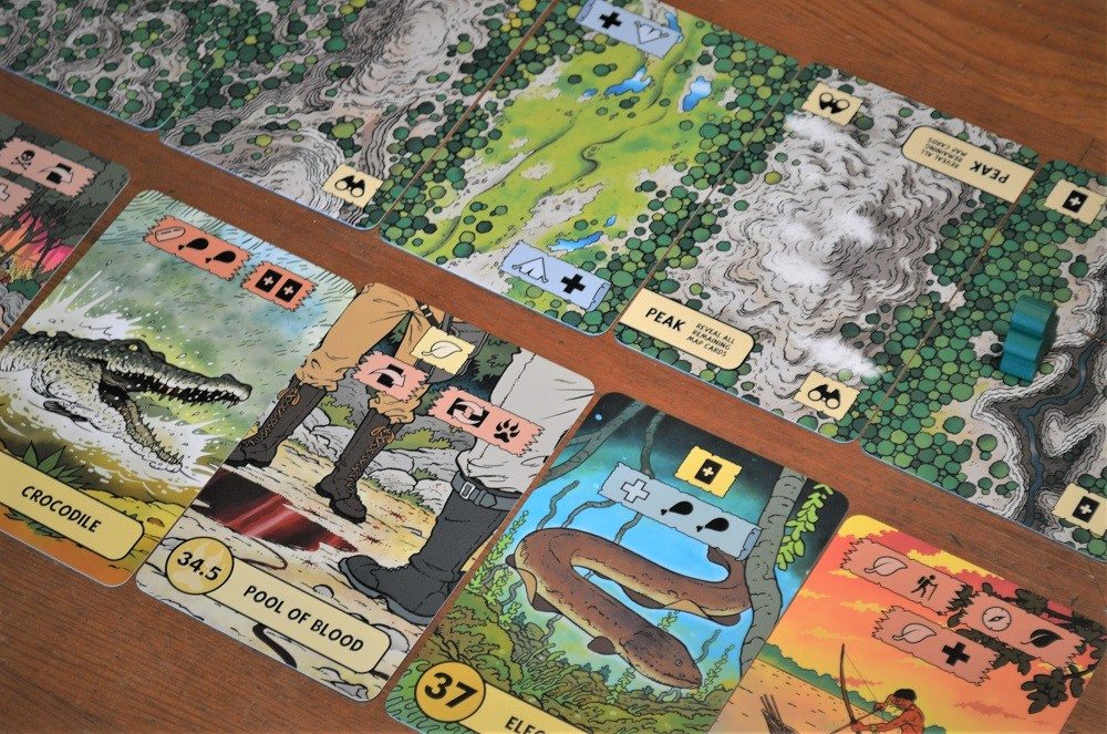 Выглядит фаза отыгрыша карт примерно так: “вот тут получаем листик, потом его меняем на палатку, далее пропускаем две карты, затем за палатку и компас (которого нет, поэтому наносим ранку) перемещаем маркер на следующую локацию”.