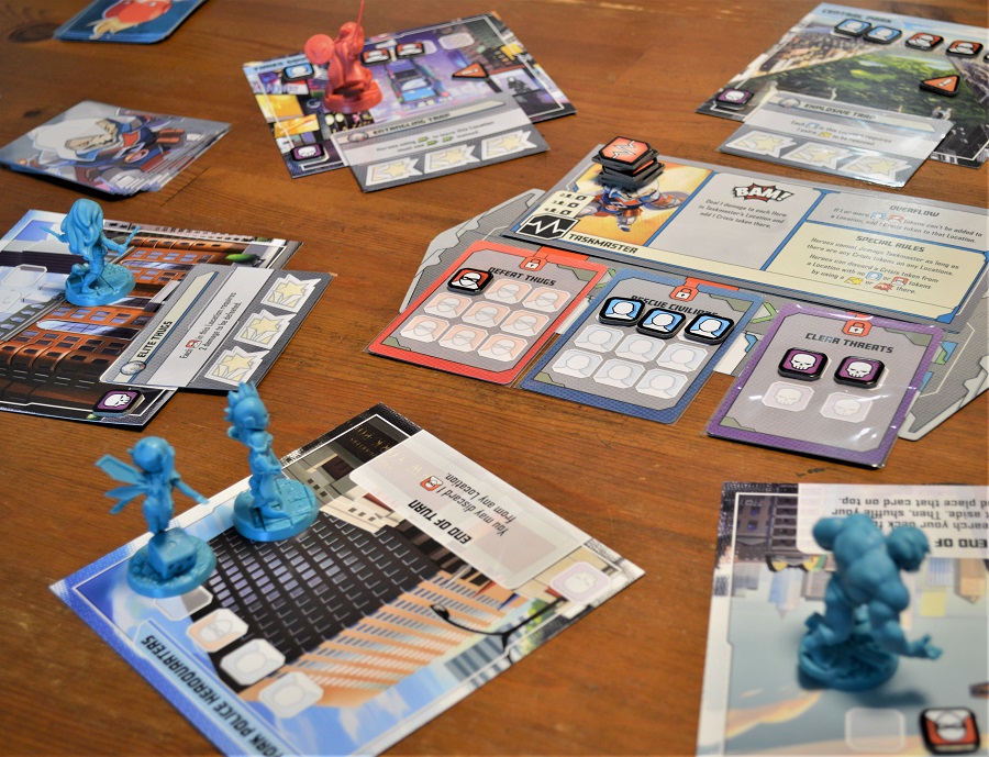 Что касается злодея, то у него тоже своя колода, но тут уже уникальности гораздо больше и за счёт самих эффектов, и за счёт уникальных условий борьбы с этим злодеем. Например, наш накидывал жетончики кризиса, и бить его можно было только после зачистки локаций от бандитов, зевак и этих самых кризисов.