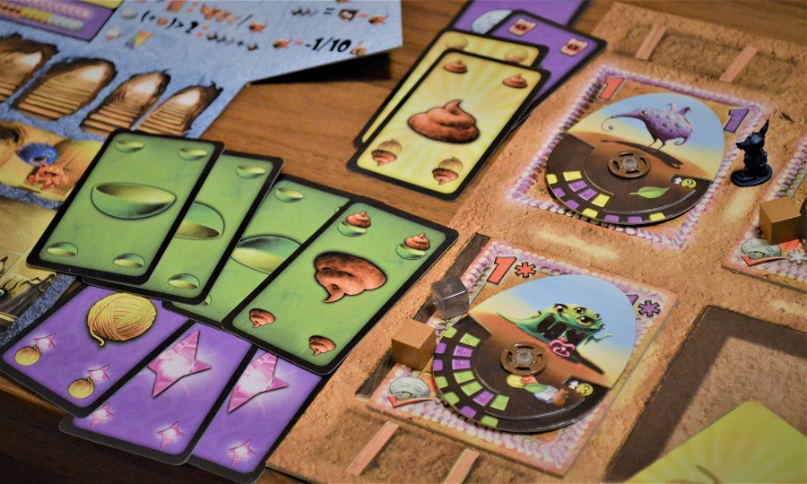 Я не любитель ставок, но тут эта механика очень здорово вплетена в размещение рабочих. Величина групп чертят (и добавленных монет) определяет очерёдность выбора действий. Ты можешь гарантированно сходить в пару локаций и забрать, к примеру, клетку, которая идеально подходит твоему пету, и заветный артефакт. Или же делать группки поменьше и совершать больше действий, только вот есть опасение, что самое вкусное уже разберут.