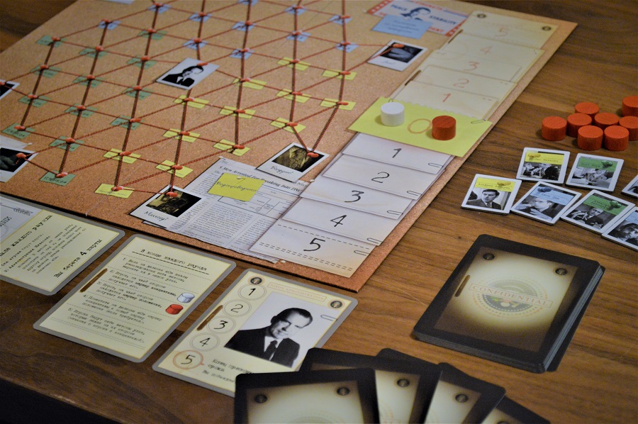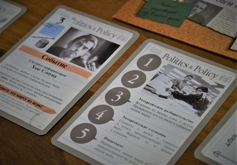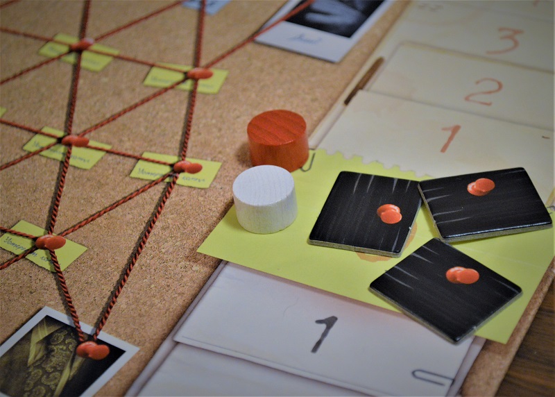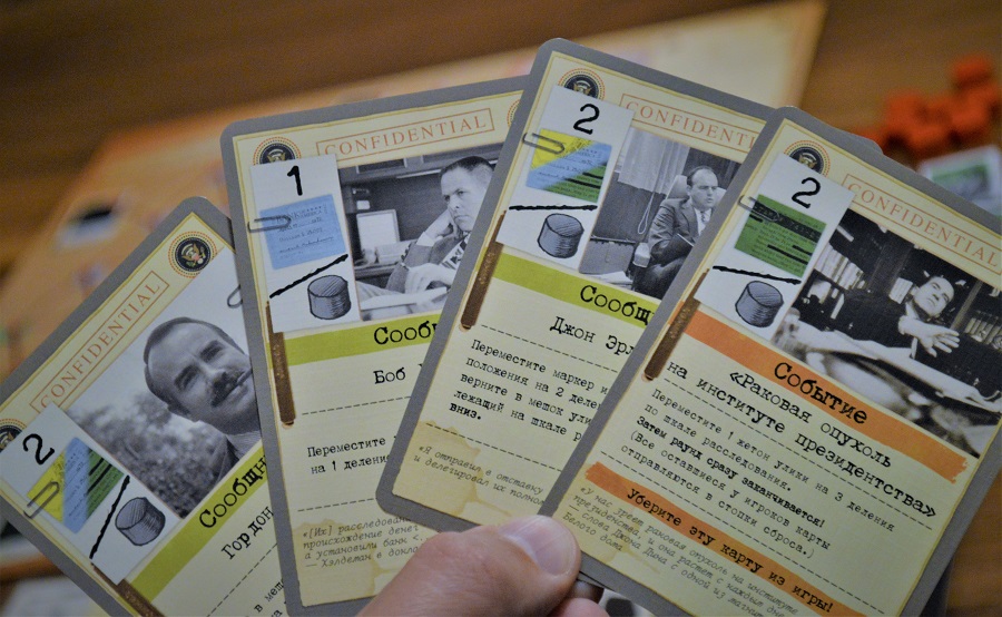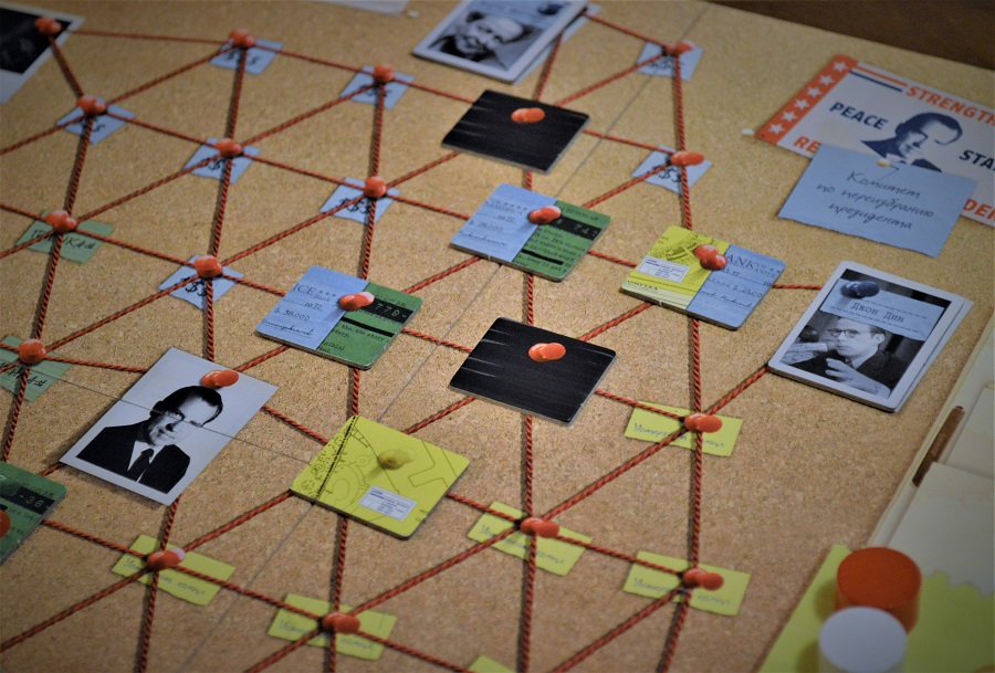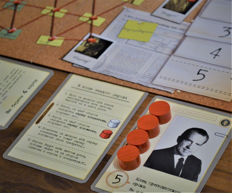По сути, процесс представляет собой этакое перетягивание каната по двум фронтам: на поле и на треке. На поле редактор старается связать жетончиками улик фотографию Никсона как минимум с двумя жетонами информаторов. Никсон же пытается ему помешать, перехватывая улики и персонажей (переворачивая их) – ему нужно лишь перетягивать красный маркер положения на свою сторону (для победы нужно сделать это 5 раз).