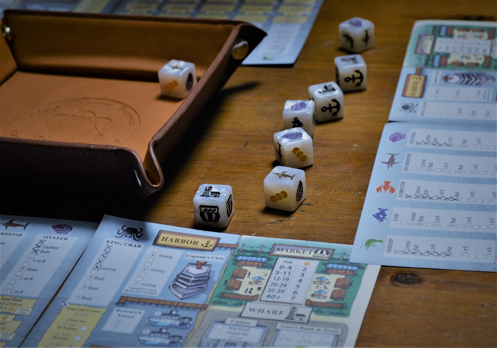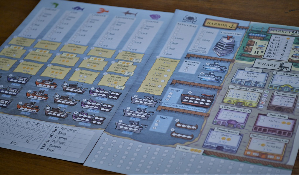 Fleet: The Dice Game. Ещё один roll-and-write, на этот раз повествующий о рыболовецких буднях. Покупаем лицензии, спускаем на воду лодки, ловим рыбу, обустраиваем набережную вспомогательными постройками.