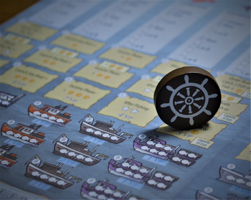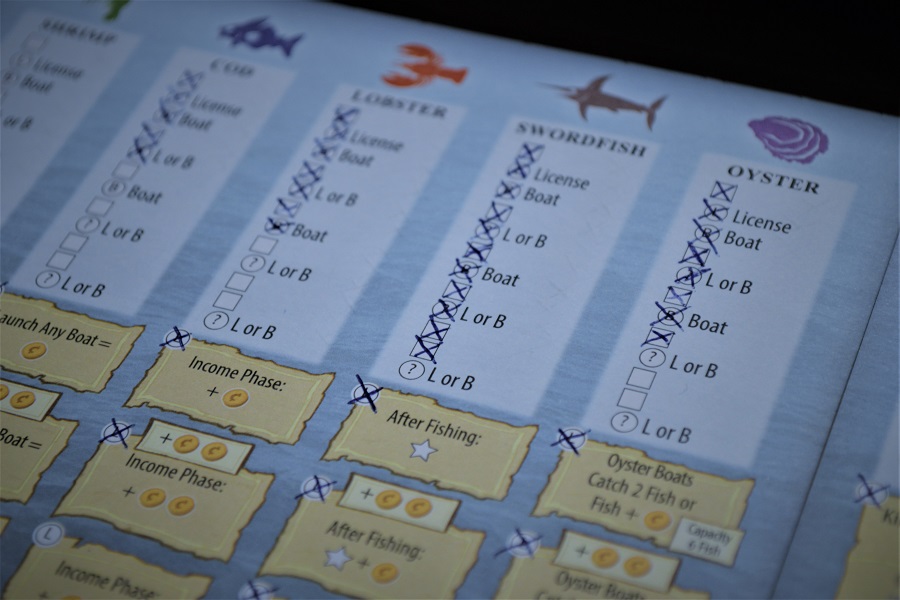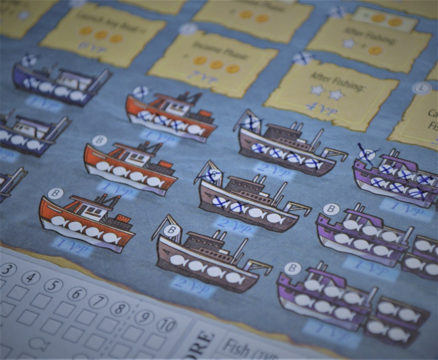 После дохода идёт ловля, но только каждый второй раунд. Тут всё предельно просто: в каждой спущенной на воду лодке можно закрасить одну ячейку-рыбу. Рыба пригодится для определённых лицензий и для рынка.
