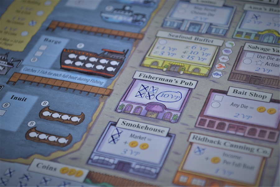 И, наконец, последняя фаза – фаза города. Тут снова бросаются кубики, но теперь уже специальные городские и только один с уловом. Принцип драфта идентичен, а вот грани иные. В гавани можно получить специальные суда или половить королевского краба с интересной лицензией; причал позволяет строить здания с уникальными полезными эффектами, а на рынке можно заработать монет согласно твоему текущему общему улову.