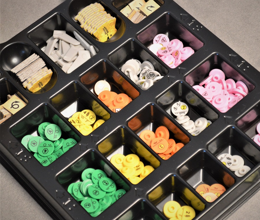 С подготовкой тоже особой возни нет: определились с тайлами, достали из органайзера необходимые специальные кругляши, выложили поддон со стандартными гранями и жетонами, и, в принципе, всё. Ну, и, разумеется, каждому достаётся стартовый капитал в виде компактного планшетика-памятки для отслеживания числа улучшений, трёх фишек пшеницы и двух кубов с простыми стандартными гранями низшего уровня.