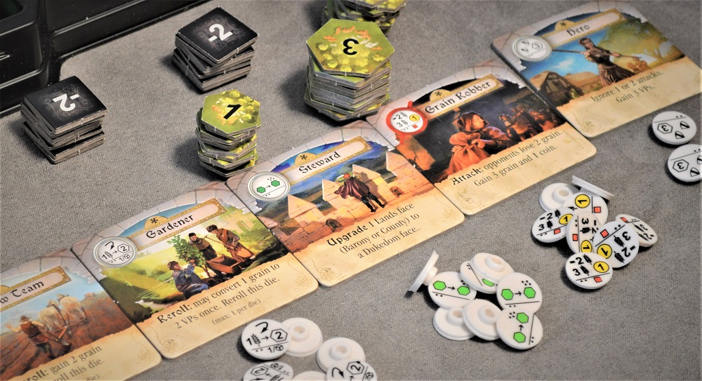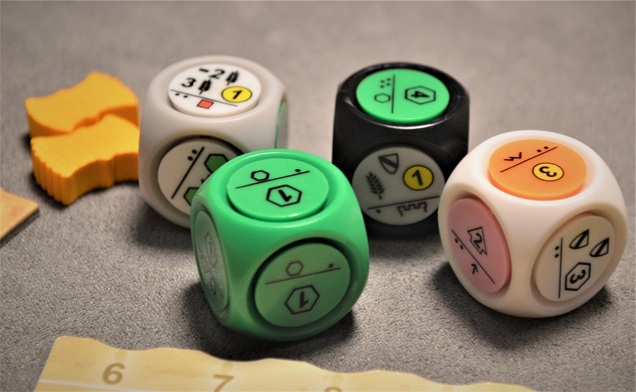 Граней за партию покупается много, у нас в среднем получалось по 15-20, поэтому даже с учётом неудачных бросков какой-никакой движок наладить удаётся. Вдобавок, с рандомом можно бороться, приобретая вспомогательные жетоны и кубы с “авто-перебросами”.
