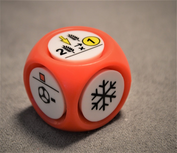 На красном кубике различные события, как плохие, так и хорошие. Но есть и одно особо пакостное – зима. Если она выпадает, то игроки сразу же платят по пшенице за кубик. Ежели платить нечем, то за каждое недостающую еду игроку вручается жетон с двумя штрафными очками. Вообще, за едой тут нужен глаз да глаз, ведь, когда у тебя становится больше кубов, то можно неплохо так огрести минусов. Остальные грани на кубике судьбы более дружелюбные. Есть даже позитивные, например, бонус к урожаю или два халявных улучшения.