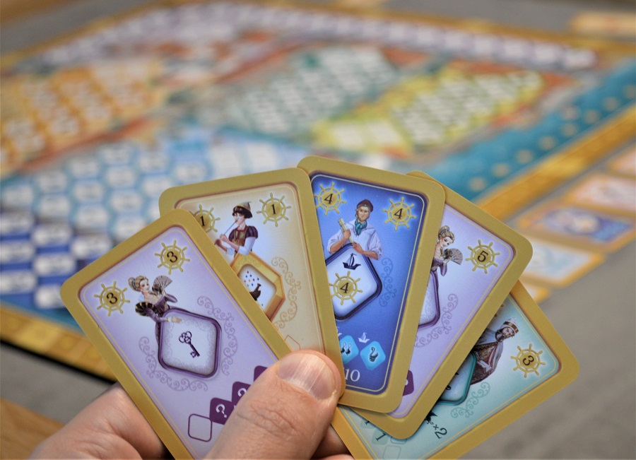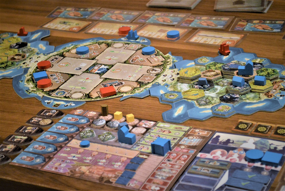 Есть ещё зона с кораблями и условной продажей товаров. И, кстати, вместно основного действия всегда можно продвинуть свой кораблик и взять очки с конечной клетки. Плюс, действие с выбранной карточки порой удаётся удачно скомбить с картами на рынке. Делается это за “звёзды”, которые даются за различные достижения в каждой зоне.