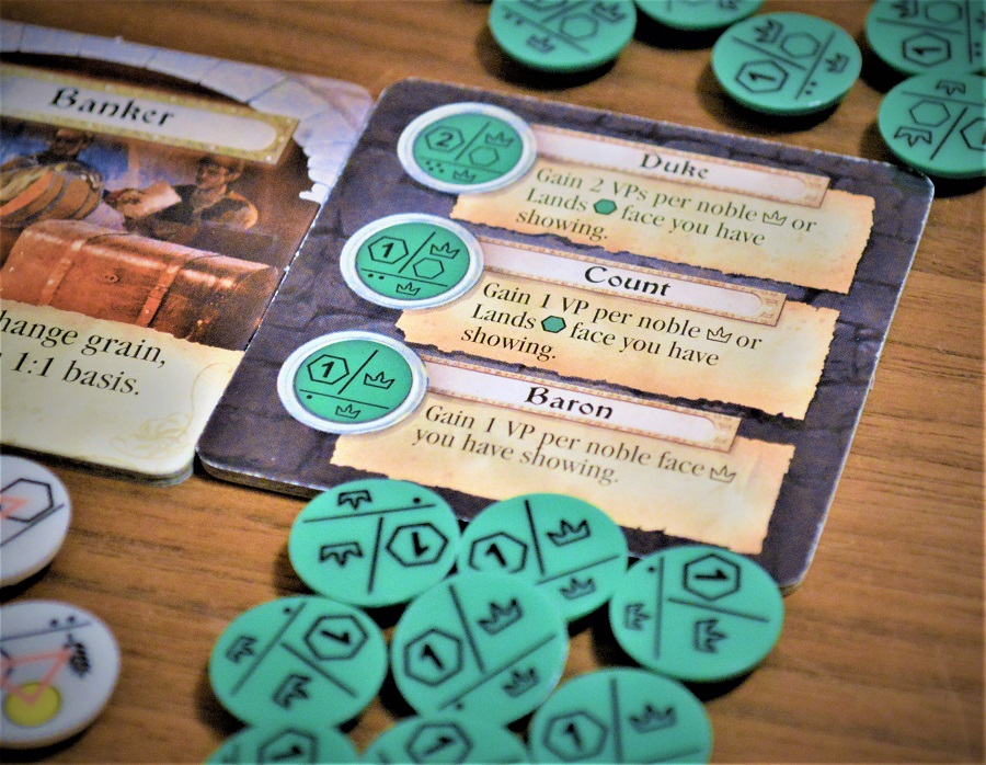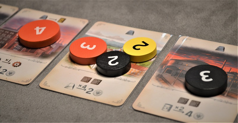Уточню, что у игроков есть фишки с циферками от 1 до 4, и этими фишками они делают ставки на карты. Карта уходит игроку с самой большой ставкой, а те, кого перебили, получают плюшки с верхней части. Более того, число плюшек зависит от номинала перебитого диска.