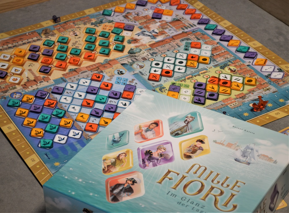 Mille Fiori. Новинка от Книции. Ух, такое типичное семейное евро, в которое можно играть с детьми и бабушками. В основе круговой драфт карточек, с помощью которых по зонам на общем поле распределяют прозрачные стекляшки.