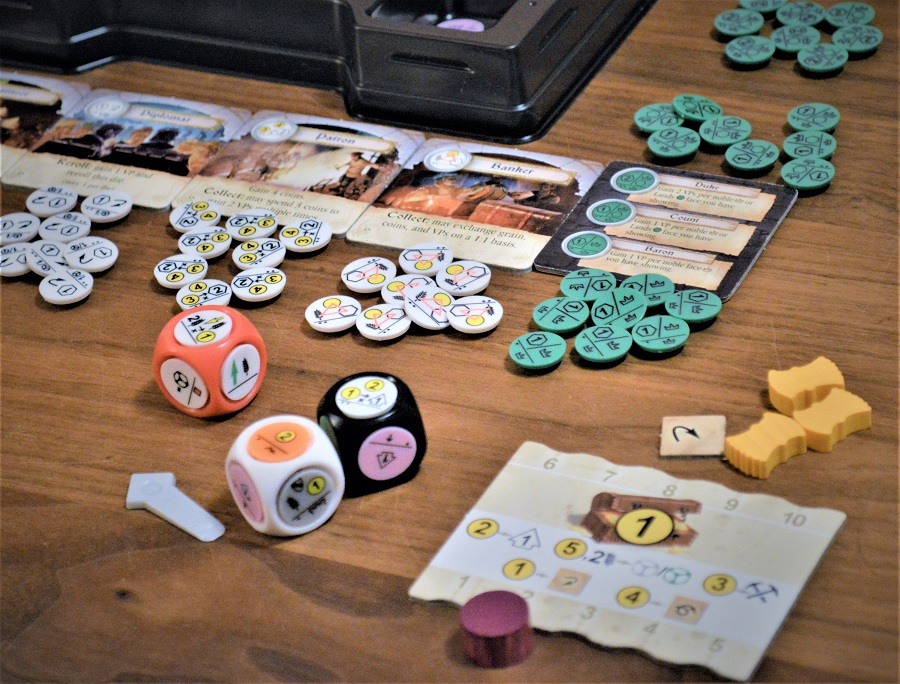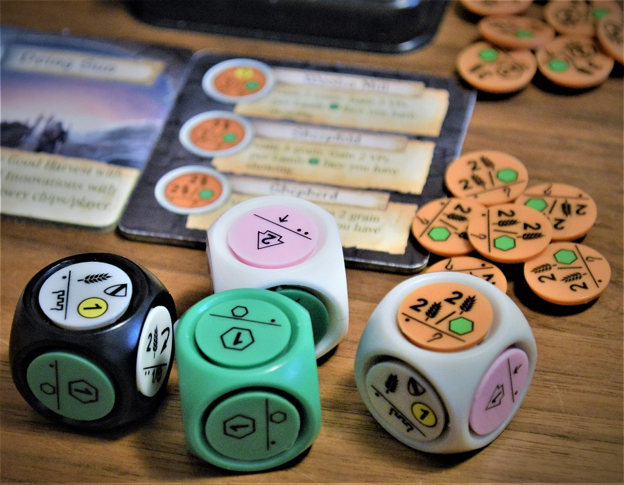 А ещё порадовали более продвинутые раскладки. Допустим, в одной на красном кубике судьбы все позитивные события пришлось заменить на спад урожая и зиму. Начало получилось очень кризисное. Вдобавок, кроме белых спец-граней начали появляться новые цветные ветки развития, состоящие из кругляшей трёх уровней.