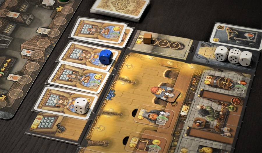 Тянем карты до лимита (его определяют свободные столы под посетителей), бросаем/драфтим и размещаем по планшету/карточкам кубы, после чего собираем урожай в монетах и пиве. За деньги нанимаем новый персонал или улучшаем планшет, а пивом завлекаем богатеев с более мощными эффектами и очковым багажом.