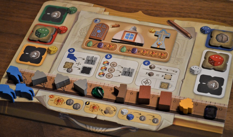 Вот и получается, что при сборе ресурсов у игрока не только выбор из 5 кубов, но и 3 опции, которые можно комбинировать в любом порядке: выгода с локации, бонус сословия и бонус за прокачанный кубик. Разумеется, поначалу это приводит к небольшому параличу, но, в целом, Собор играется бодро, ибо остальные действия предельно простые: бронь карточки флажком и транспортировка трёх материалов.