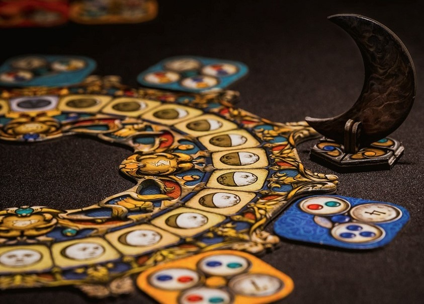 Nova Luna. Компактный абстракт от Уве Розенберга по типу Пэчворка. Тут тоже есть условное время, влияющее на очерёдность хода, и выбор из трёх тайлов, но вот шитьё одеяла из полиминошек заменено на ещё более отвлечённое формирование цветных групп.