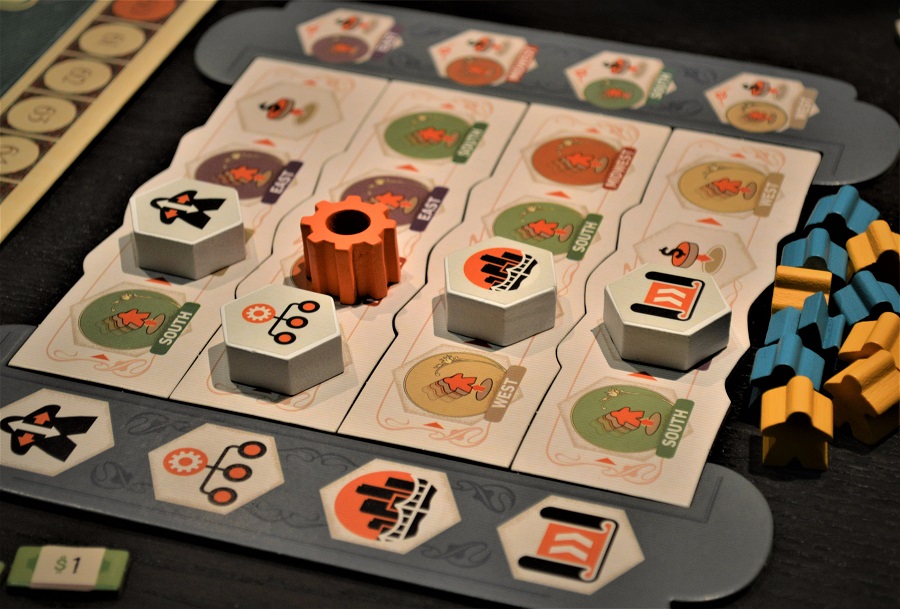 Чем же уникальна Карнеги? Во-первых, механикой выбора действий. Выставляя шестерёнку-маркер на предварительно сформированное мини-поле, игрок определяет набор манипуляций на основном поле и личном планшете не только для себя, но и для всех соперников сразу.