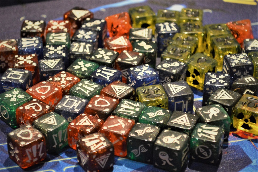 И, да, игроки могут докупать новые кубики – на это тратятся жетончики опыта, которыми поощряется успешное прохождение этапов миссии. На старте кампании у всех по 5 определённых кубов. Ещё можно пополнять колоды новыми картами.