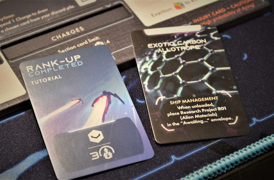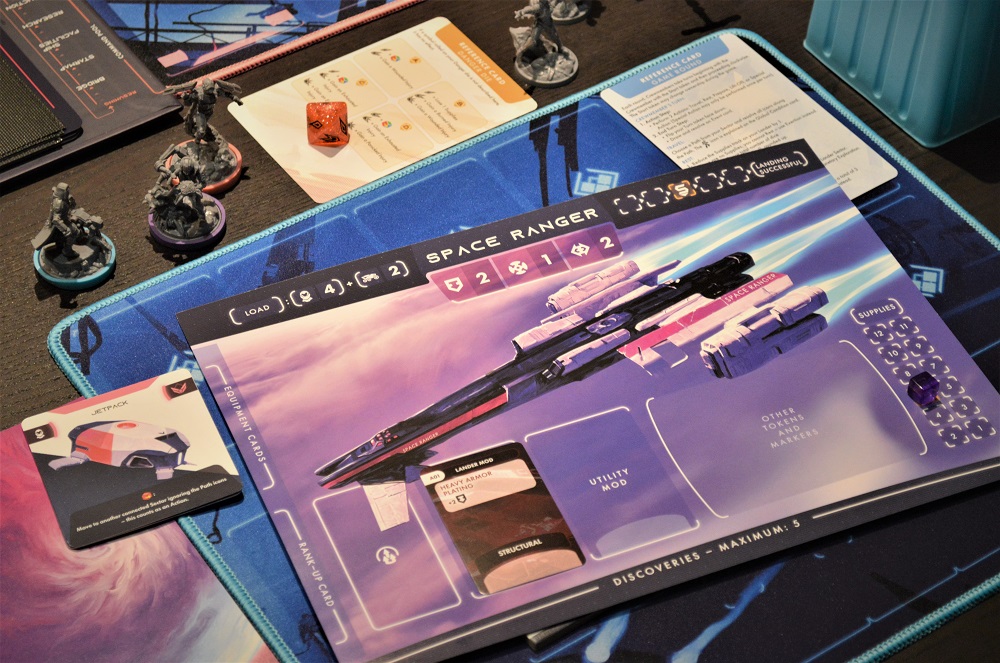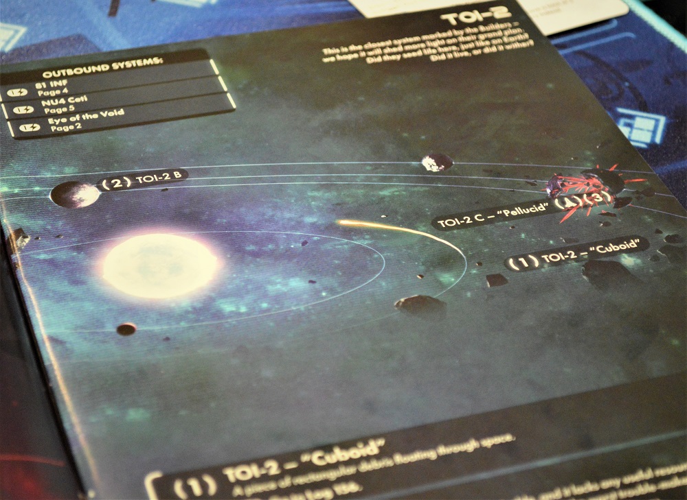Каждая миссия — это вполне стандартная бродилка с тестами на кубах. Действие происходит на одном из разворотов специальной книжки, куда выкладываются карты локаций (некоторые уже пропечатаны). Цели же задают карты миссий: что-то обнаружить, взять образцы и вернуться на родненький ISS Vanguard.