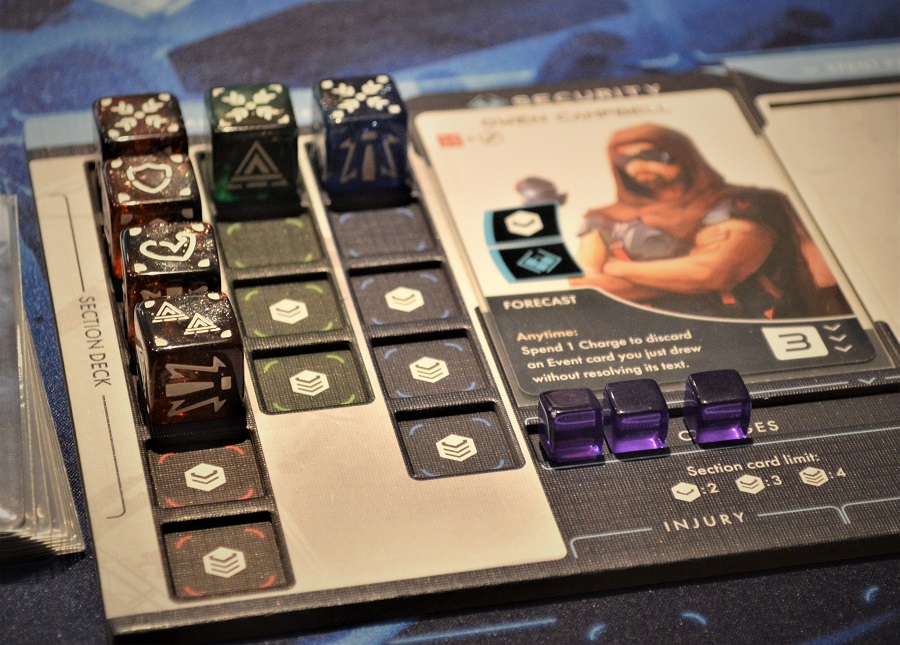 Например, потраченные в проверках кубики игроки восстанавливают либо снижая уровень запасов, либо постепенно истощаясь (сбрасывая по кубику из пула навсегда). Или ранее упомянутое сканирование, где за энергию можно узнать символы, требуемые в локациях.