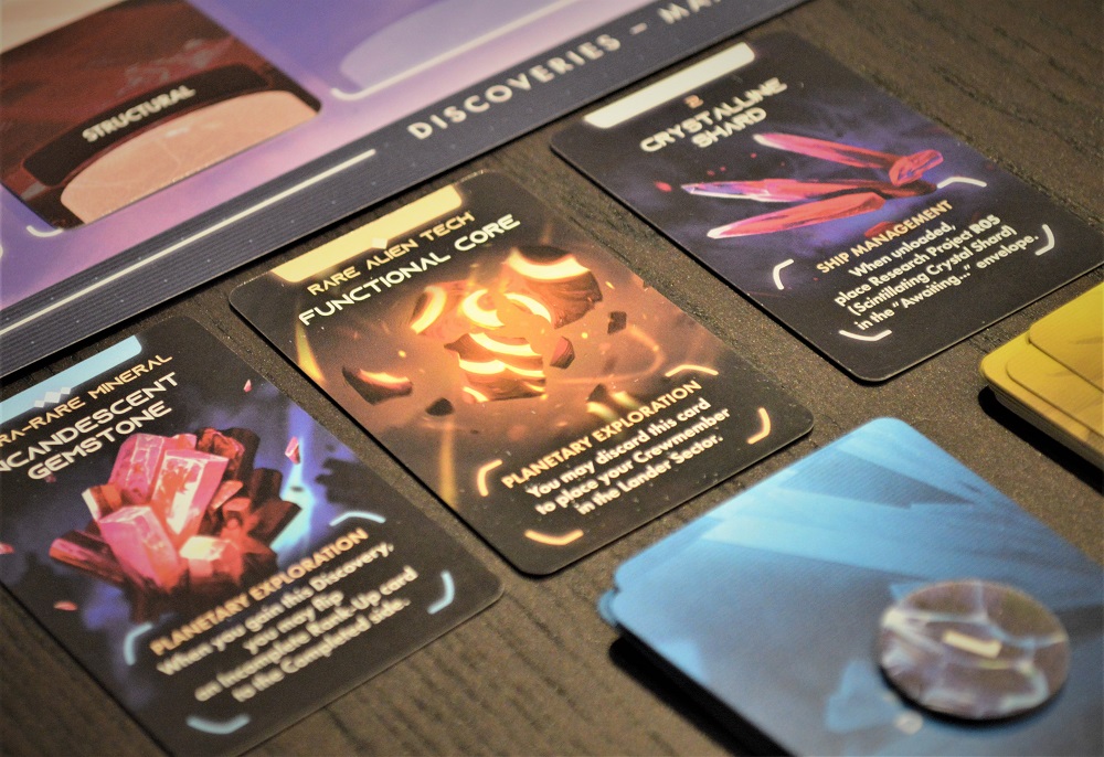 Успешное прохождение проверок не только приводит к чтению новых параграфов, но и позволяет заполучить так называемые открытия. Некоторые открытия уникальны и связаны с конкретной миссией, другие же можно обнаружить везде, и представлены они колодами нескольких типов (инопланетные технологии, флора, организмы и т.п.). Где-то есть понятные плюшки, другие же карты потенциально можно отправить в лабораторию, либо их предназначение раскроется позже.