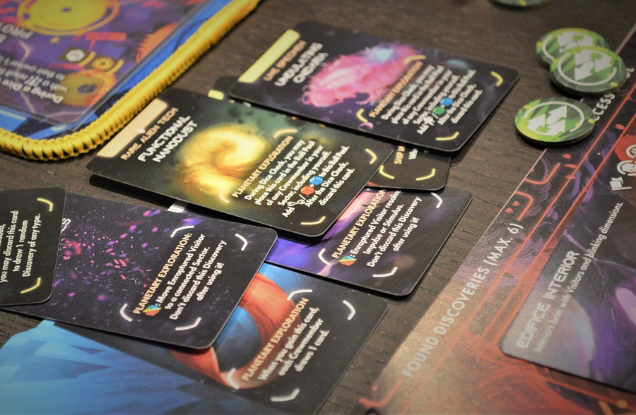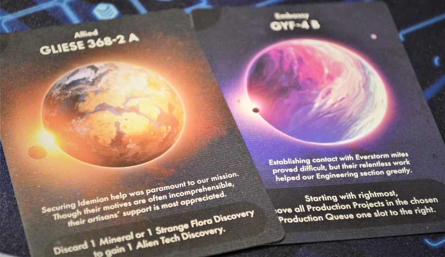 Взамен при каждом посещении отсека разрешается выбрать одно из свойств (по ключевому слову) и активировать все перевёрнутые (с послами) карточки, где это свойство имеется. У нас, например, появилась возможность обменивать находки на другие типы и ускорять разработку проектов. Немаловажно и то, что дипломатия — это ещё и способ, как освободить от персонажа кармашек нужного тебе ранга.