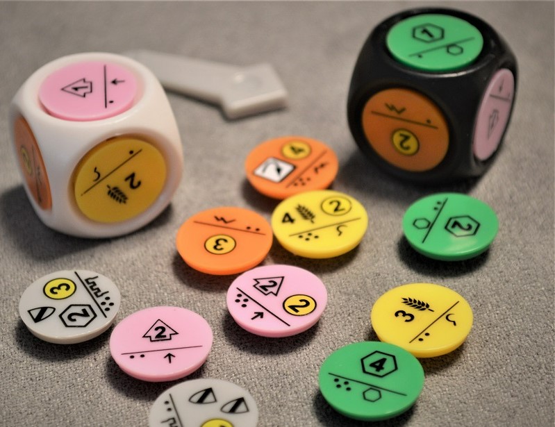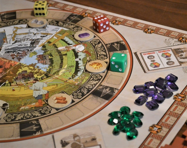 Dice Realms. Дорогущая коробка, забитая мелкими деталями для крафта кубиков. Поначалу было интересно, но где-то после 5 партий пришло понимание, что уникальные раскладки тайлов свойств особо не меняют рисунок игры: качаешь кубы, уходишь в 1-2 наиболее выгодных эффекта, а там как повезёт. Ну, и слишком много возни с постоянной сменой граней. Как филлер с необычной кастомизацией кубов, неплохо, но не более. В итоге DR покинула коллекцию после десятка партий.