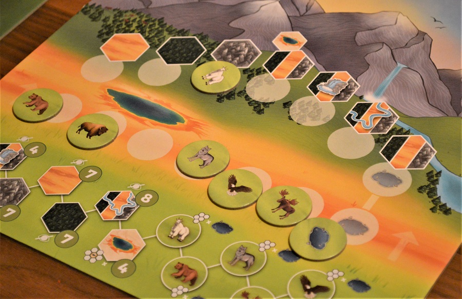 Изюминка игры заключается в механике выбора тайлов. В начале раунда на вспомогательном поле всегда доступно 7 жетонов: 6 животных и 1 водоём. В свой ход активный игрок выбирает один из жетонов и сдвигает его к ячейке местности, куда бы он хотел его разместить: на конкретный тип ландшафта, на реку, водопад или рядом с гейзером. Обособленно стоит водоём, тайл с лужицей можно разместить куда угодно.