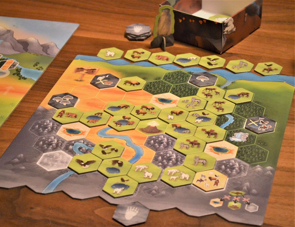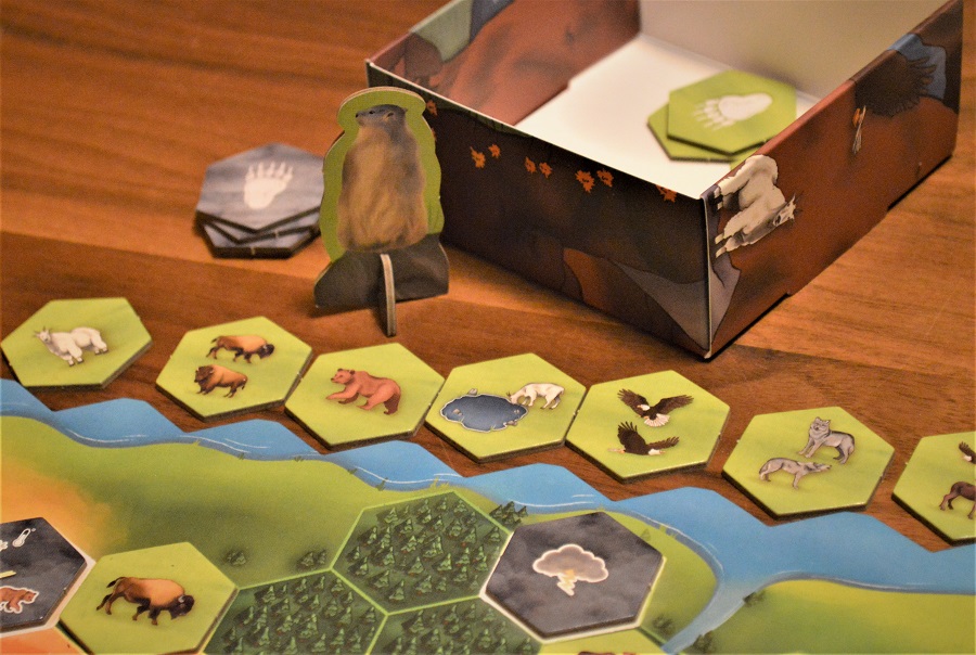 Так вот, после выбора все окидывают взглядом свой запас, который располагается над планшетом, берут один из тайлов с выбранным активным игроком животным и размещают на обозначенную местность. Ежели, такого животного или свободного гекса, например, леса нету, то данное требование можно проигнорировать и взять любого зверя или закрыть любой террейн.