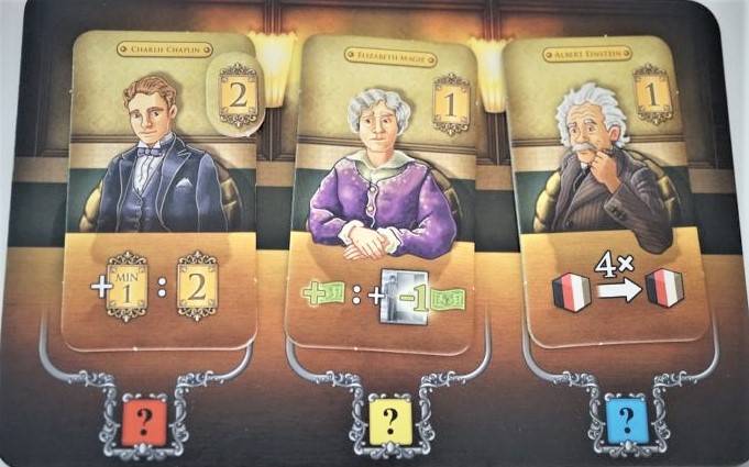 Последний модуль, который пока не довелось опробовать — это важные гости. Правилами не рекомендуется использовать гостей вместе с балом, а то от обилия вариантов и бонусов глаза будут разбегаться. Гости заменяют три кубика на цветные, и их можно приглашать до обычного действия, заплатив столько денег, сколько белых кубиков в колонке. После этого игрок берёт соответствующего гостя и довольствуется его бонусом до конца раунда. Ничего не напоминает? Да, похожий модуль есть в допе к Марко Поло. Всего в наборе 20+ уникальных гостей. Ещё отмечу, что, если гостя никто не приглашает, то он становится привлекательней за счёт повышающейся с помощью специального жетончика награды в ПО.