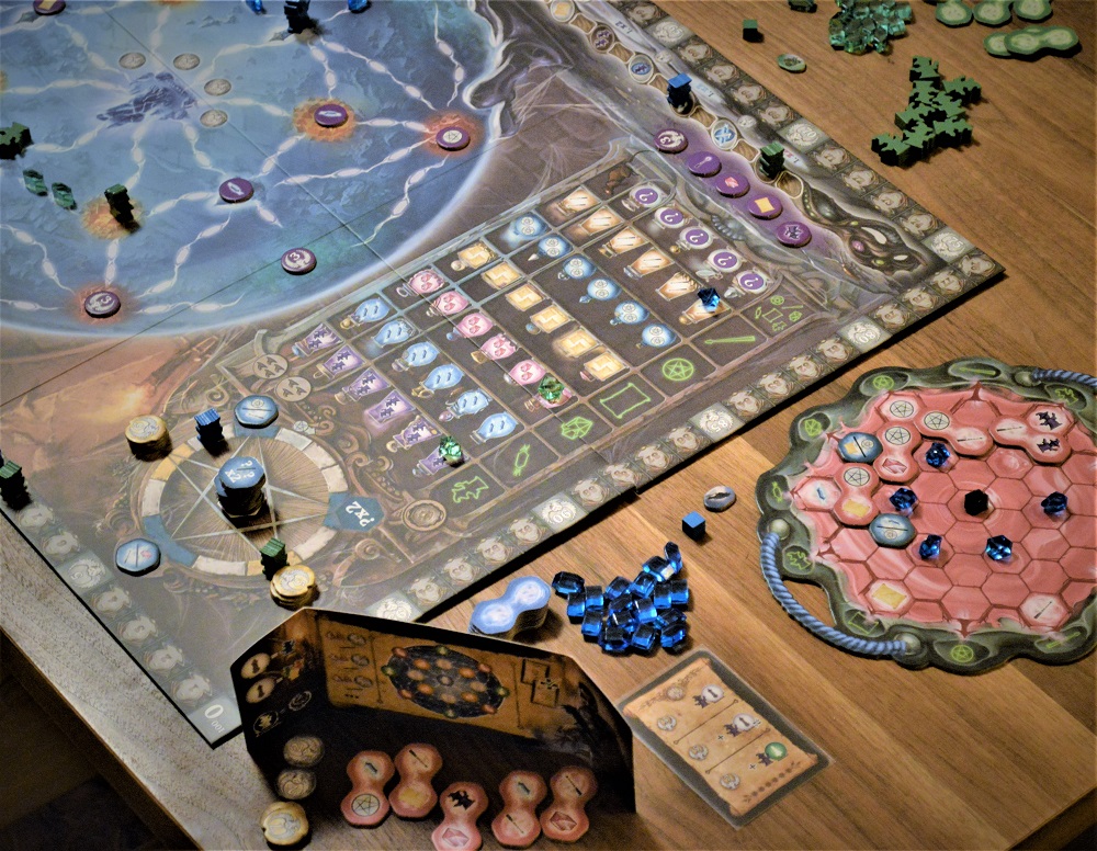 Добавляем к этому приятное оформление, быстрый сетап и партии около часа – и получаем образцовую семейку. Да, может, тут нет бешеной вариативности, ибо каждый раз ты распоряжаешься шестью неизменными действиями, нацеленными на получение ПО от неизменных источников, но, когда склоняешься над котлом и начинаешь думать о потенциальных комбушках, то это перестаёт быть такой уж проблемой. Процесс цепляющий и действительно азартный. Пока 7.5/10, а дальше посмотрим.