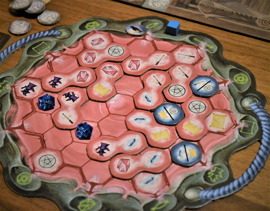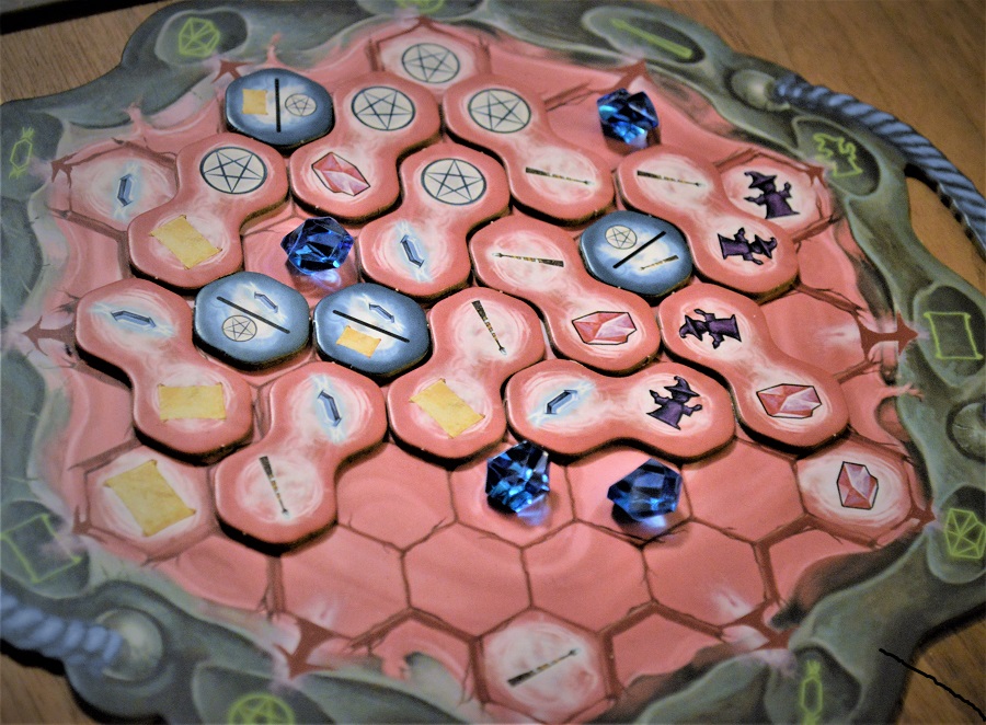 Действия выполняются путём заполнения котла специальными сдвоенными гексами с символами. У всех идентичный набор из 15 тайлов. На партию же разыграется всего 11. То есть, на всё про всё у игрока одиннадцать ходов. Тайлы приходят случайным образом и хранятся за ширмой, где всегда есть выбор из 5 штук.