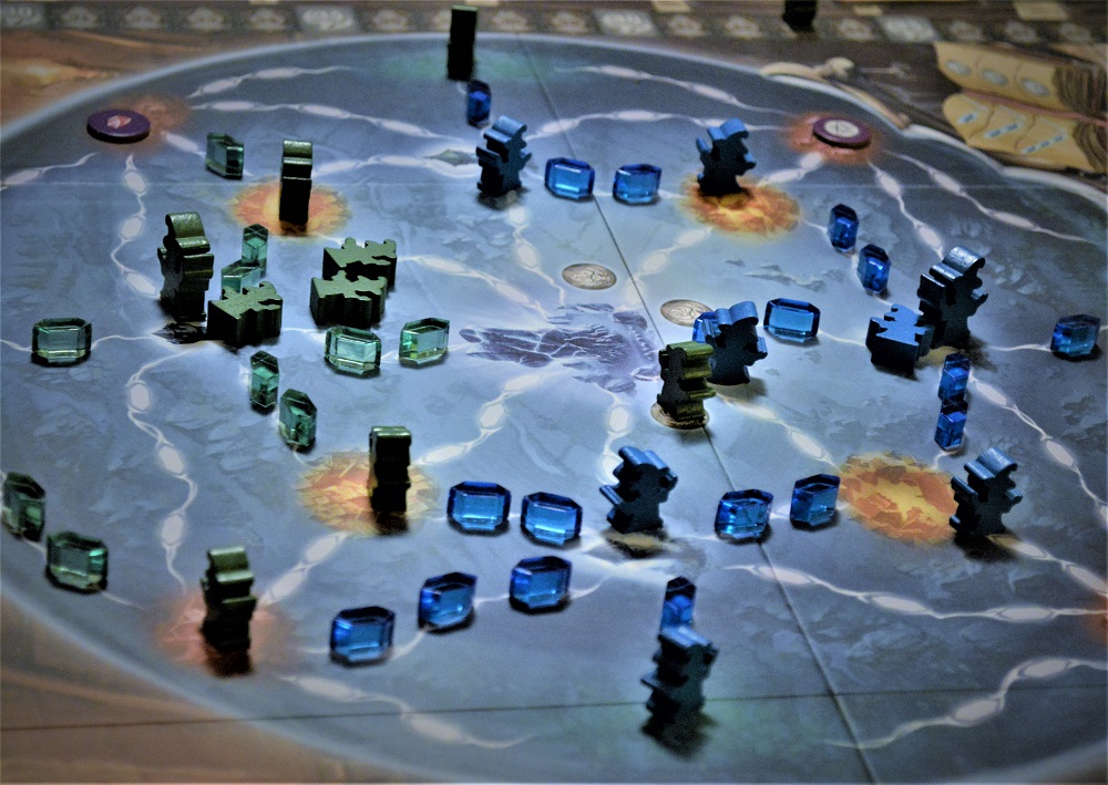 Всего разных действий шесть. Энергия позволяет создавать сеть маршрутов вокруг священного камня или попросту соединять нужные локации фишками энергии.