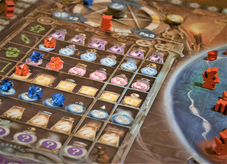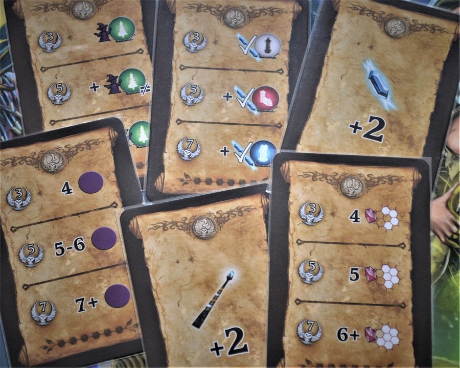 Ну, и наконец, свиток позволяет брать с рынка карты что-то вроде заклинаний, которые бывают двух типов: на усиление действия или на очки за выполнение конкретных условий. К примеру: выставить ведьм в локации указанных цветов, соединить определённые места фишками энергии и т.п.