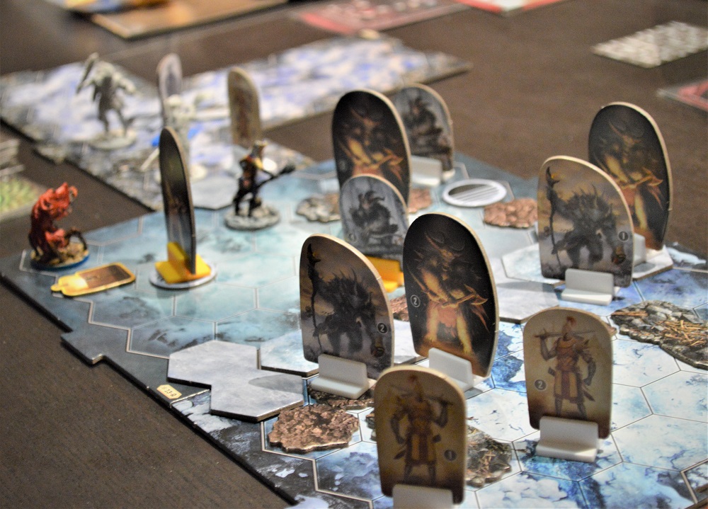 Ещё из якобы простых у нас участвует Banner Spear. Честно говоря, я бы дал ему средний уровень, так как даже стартовая колода подразумевает постоянную пространственную головоломку. Дело в том, что многие атаки завязаны на расположении не только героя, но и союзника. Плюс, несколько карточек позволяют этих самых союзников суммонить (для которых теперь есть отдельные синие подставки и красочные жетоны, как у героев), а также выставлять так называемые знамёна, положительно влияющие на всех, кто находится на определённом расстоянии. В общем, всё время нужно умело пристраиваться и к врагам, и к товарищам, а также контролировать инициативу. Иначе будет много осечек.
