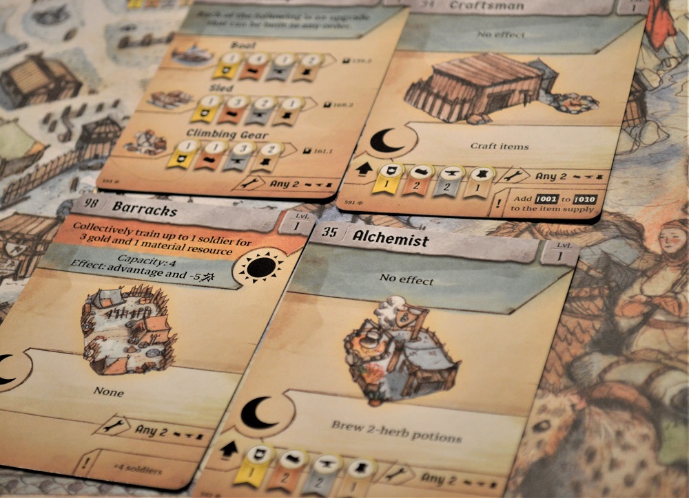 В мастерской можно построить лодку, сани и альпинистское снаряжение. У ремесленника – создать за ресурсы новое оружие и броню. Я, например, за 1 шкуру сшил накидку, повышающую лимит здоровья на единицу. В лавке алхимика можно варить зелья, но строго из двух трав. И, наконец, в бараках тренируются солдаты для защиты от набегов. На листе кампании есть специальная зона, где они отмечаются.