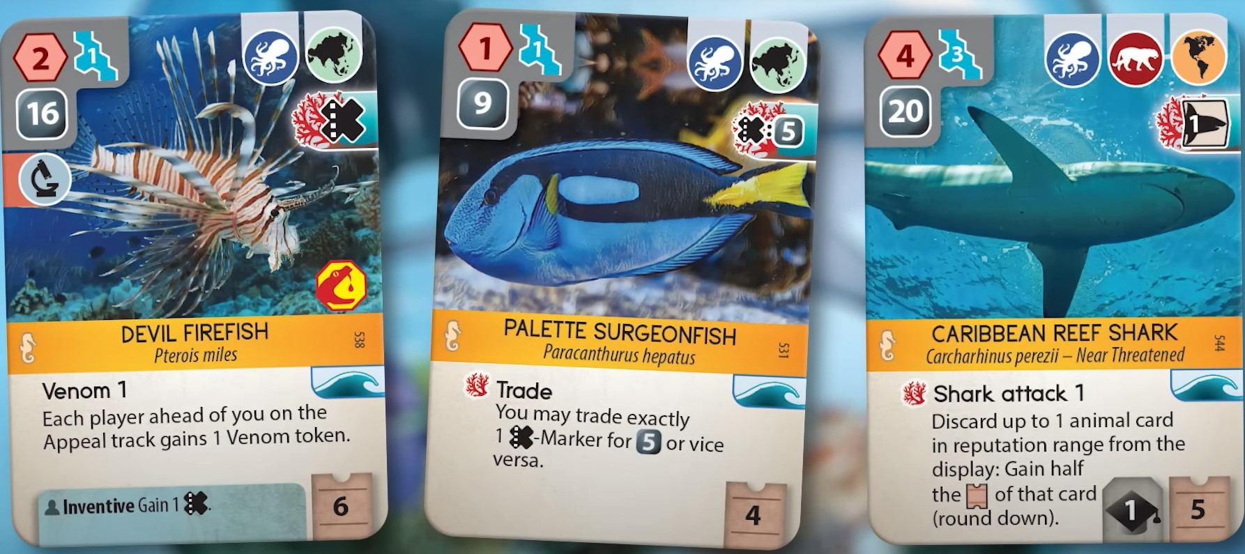 Ещё одно, на мой взгляд, прикольное новшество, которое благотворно повлияет на разнообразие карточного движка – это новый эффект на картах обитателей рифов (reef dwellers), расположенный справа чуть ниже привычных тэгов. Так вот, как только игрок разыгрывает такое животное, то оно тут же активирует reef-свойства на всех ранее выложенных карточках. Больше комбо!
