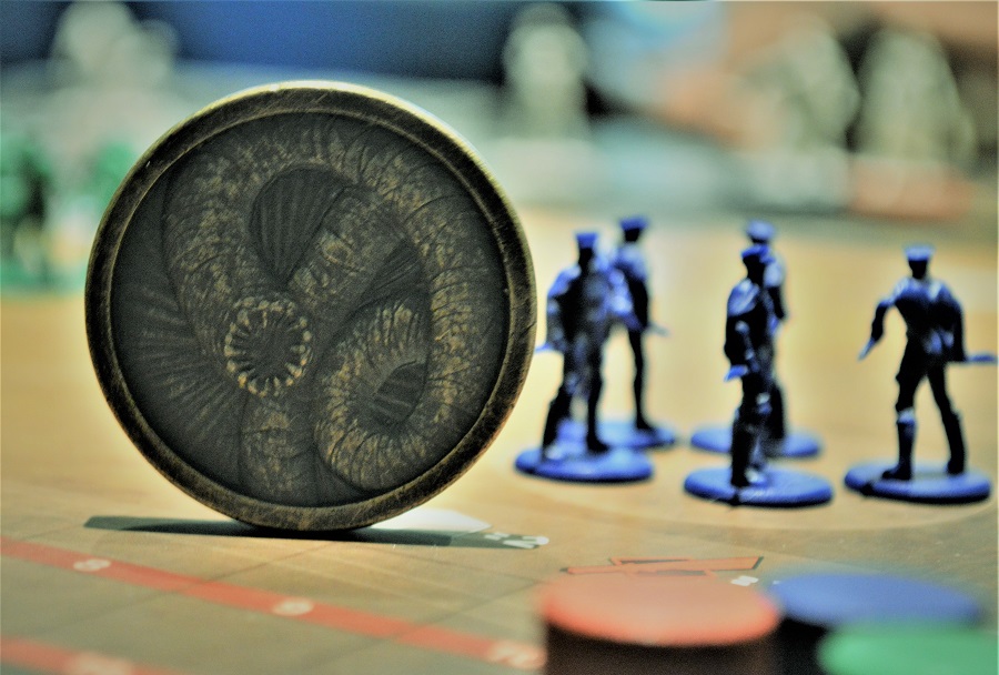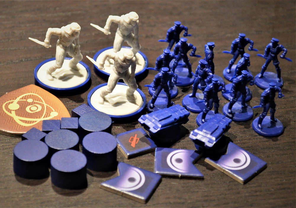 Ну, и “прокачанная” версия радует глаз фигурками экзокостюмов, пластиковыми жетонами и маркерами, а также металлическими кубиками ресурсов.