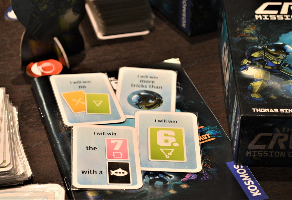 The Crew: Mission Deep Sea. Начали прохождение второй коробочки Crew (тут обзор первой). Это всё та же кооперативная игра на взятки с идентичным принципом их розыгрыша. Сперва капитан (первый игрок) задаёт ведущую масть, после чего остальные по кругу обязаны кинуть по карте такого же цвета. Если такого цвета нету, то можно выложить любую другую масть, либо козырь. Берёт взятку тот, у кого номинал ведущей масти выше или тот, кто сыграл самый сильный козырь.