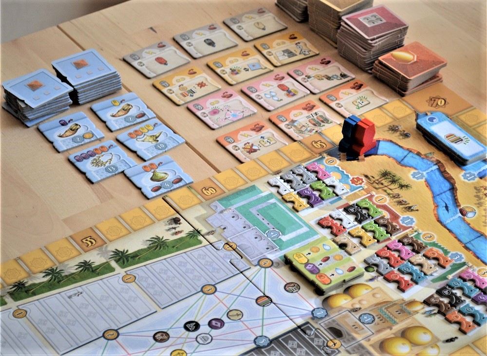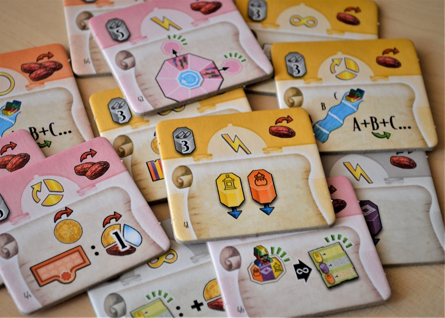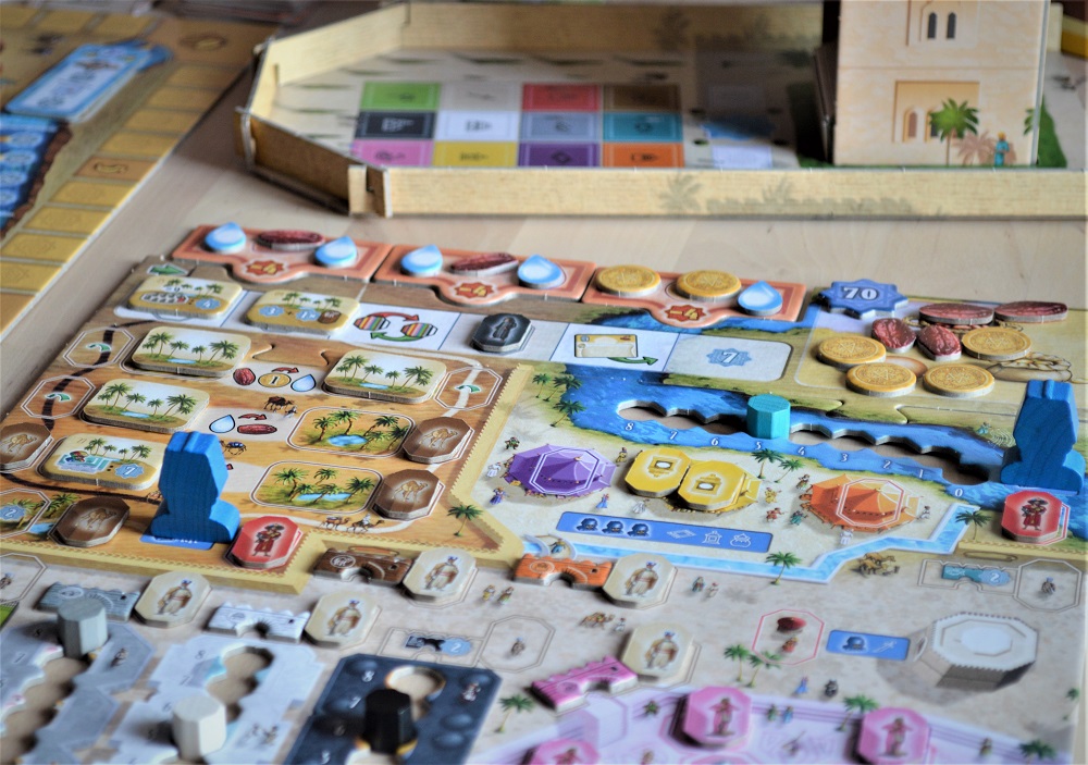Как видно, перед нами этакий салатище на добычу ресурсов и набор очков разными способами. Среди них есть как интересные (технологии, оазисы), так и стандартные (сад, драгоценности). В принципе, ничего удивительного. Что же действительно порадовало, так это неочевидные и интересные решения каждый ход. И дело не только в вычурной башне, которая, по сути, служит рандомайзером, добавляя рандома и азарта в сухие расчёты. Дело ещё и в напряжённом выборе. И тут от драфта у меня ощущения схожи, к примеру, с Азулом. Нужно смотреть, что нужно сопернику, что, скорей всего, останется тебе и т.п.