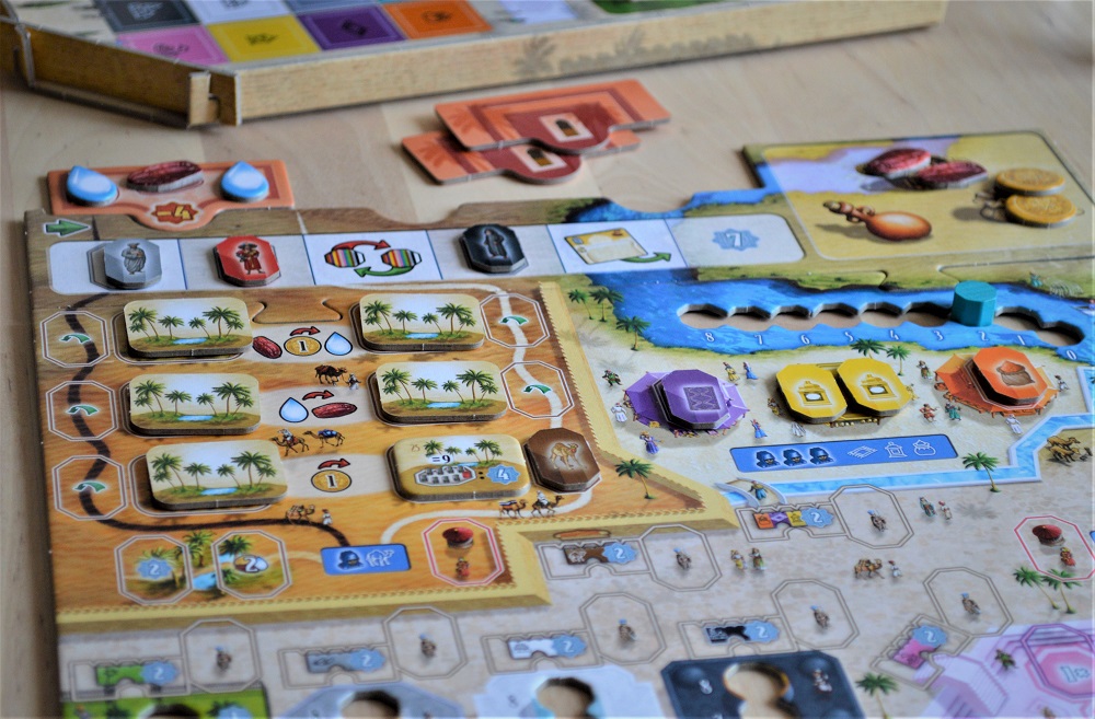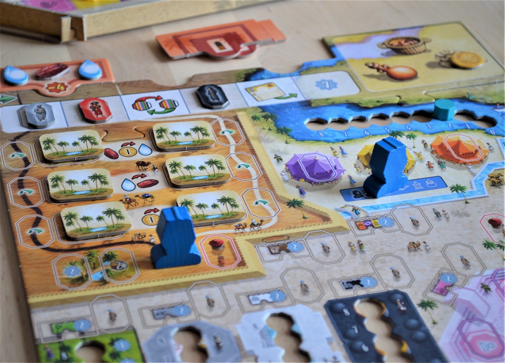 В коричневой зоне (пустыня) выставлением фишек игроки постепенно открывают оазисы, а действием их покупают. При этом оазисы отправляются на специальный трек, где за них можно получить плюхи. Сами же оазисы – это своеобразные цели на дополнительные очки. В конце партии можно заскорить максимум 3 оазиса.