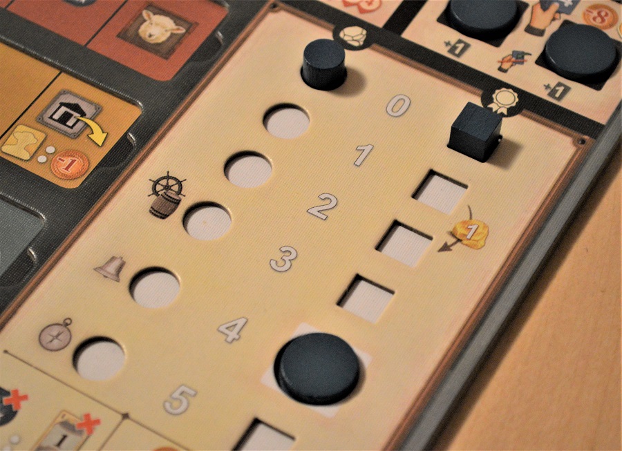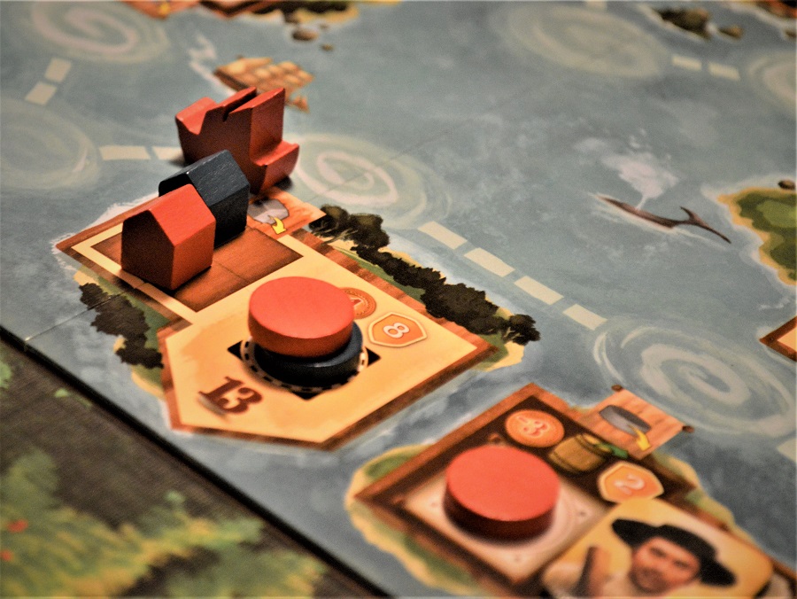 А получить бонусные карточки можно с помощью трёх других новшеств (и ещё за устранение преград): домиков-хранилищ, золота и второго рынка. Домики берутся с нижней части планшета и выставляются в порты на морском поле. Логично, что для доступа к этим самым портам необходимо перемещать фишку корабля активацией некоторых построек. Тут ещё пригодятся моряки, заменившие в НЗ машинистов.