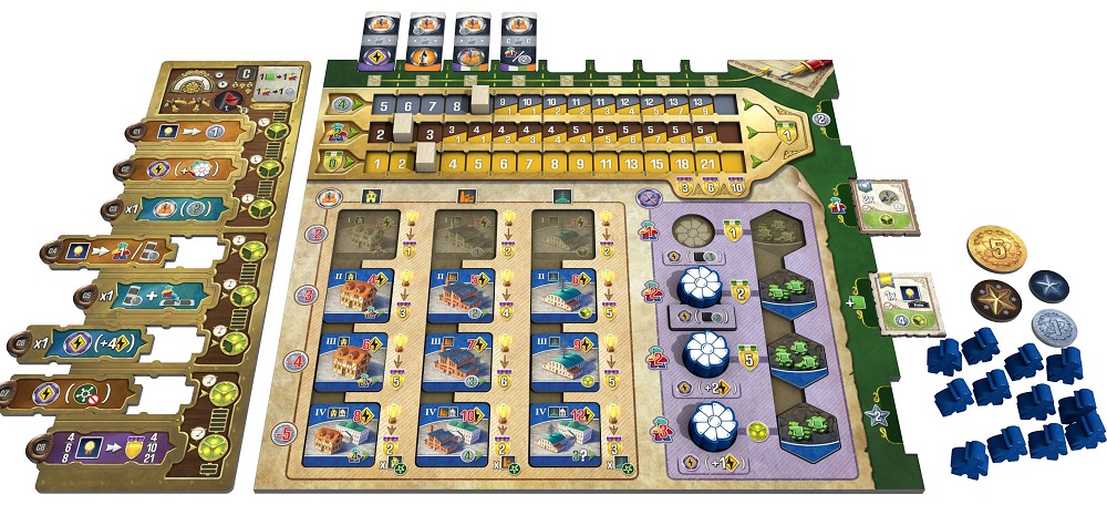 Nucleum. Очередное евро от итальянцев Luciani и Turczi с нотками Плотины и Брасса. Основная концепция – выбор двойных тайлов действий, с помощью которых игроки развивают инфраструктуру на поле.