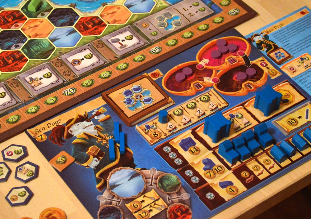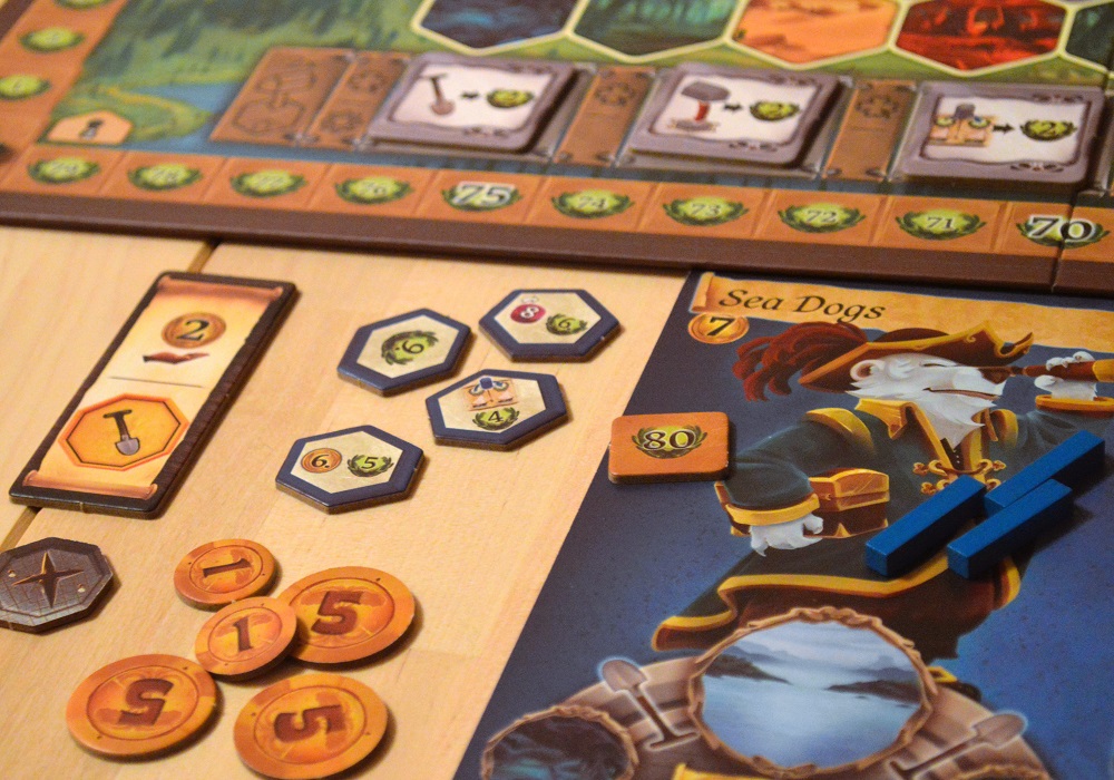 Terra Nova. Урезанная и, я бы даже сказал, семейная версия Терра Мистики. Убрали треки, сократили число раундов до 5, из валюты оставили лишь монеты. Благо, фирменную циркуляцию силы не тронули.