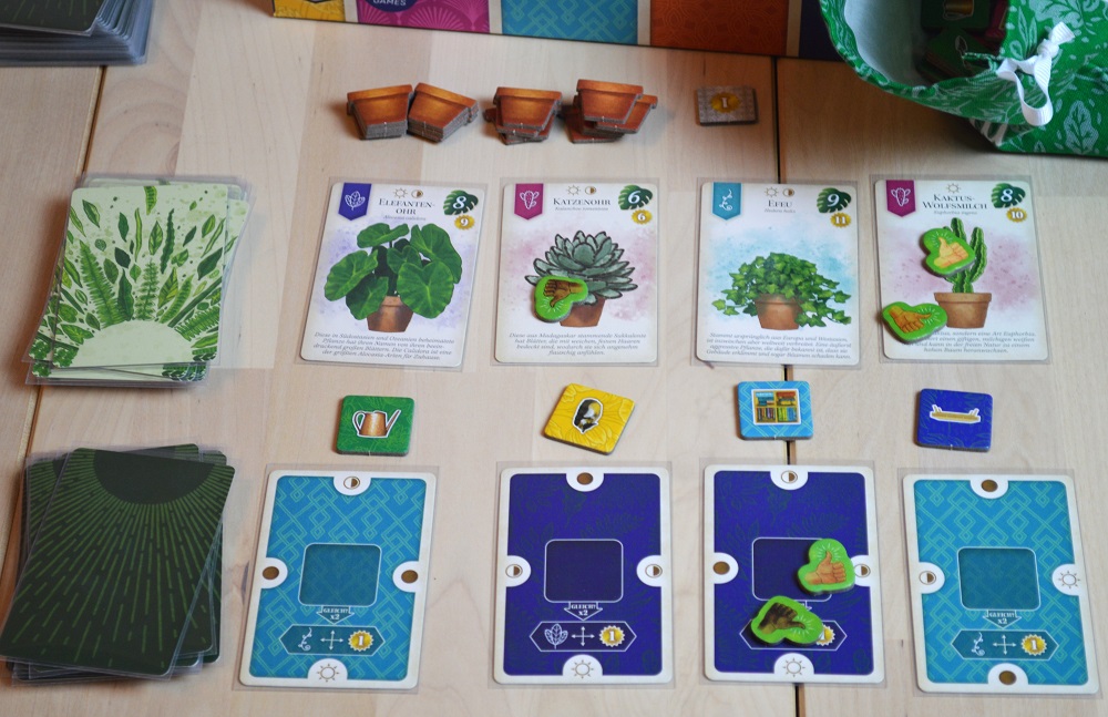 В продвинутом режиме добавляются ещё и общие цели. А, вообще, борьба тут идёт не только за карты и жетоны, но и за горшки. Они кладутся на полностью выращенные цветы и имеют разную ценность, отчего копить зелень желательно быстрее.