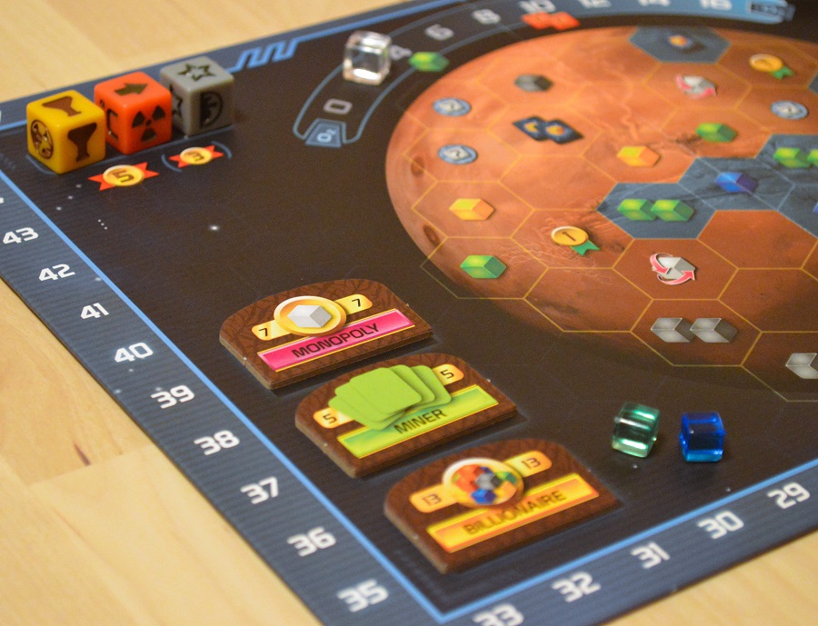 Terraforming Mars: The Dice Game. Очередной Марс. С таким же убогим оформлением, но теперь на кубиках. Процесс схож: играем карты, поднимаем параметры, соревнуемся за цели.