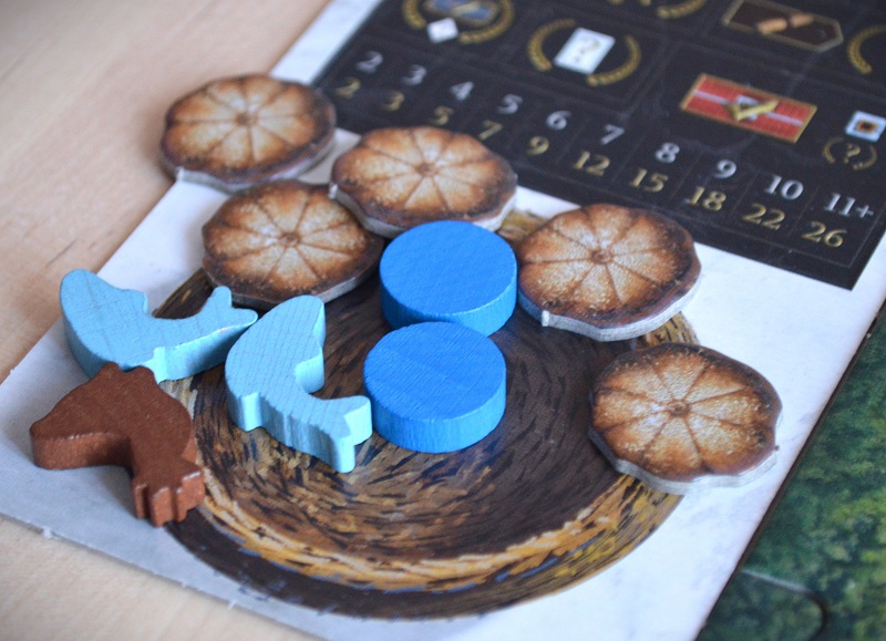 Ещё один странный момент  – жетончики свитков, которые не несут никакой смысловой нагрузки, так как сами свитки уже нарисованы на планшетах. Идею свитков, видимо, вырезали из базы, а сами жетончики забыли убрать, так как потом им сразу же было найдено применение в мини дополнении (с мини-допом жетонами заполняются специальные плашки, на чём можно заработать некоторые бонусы).